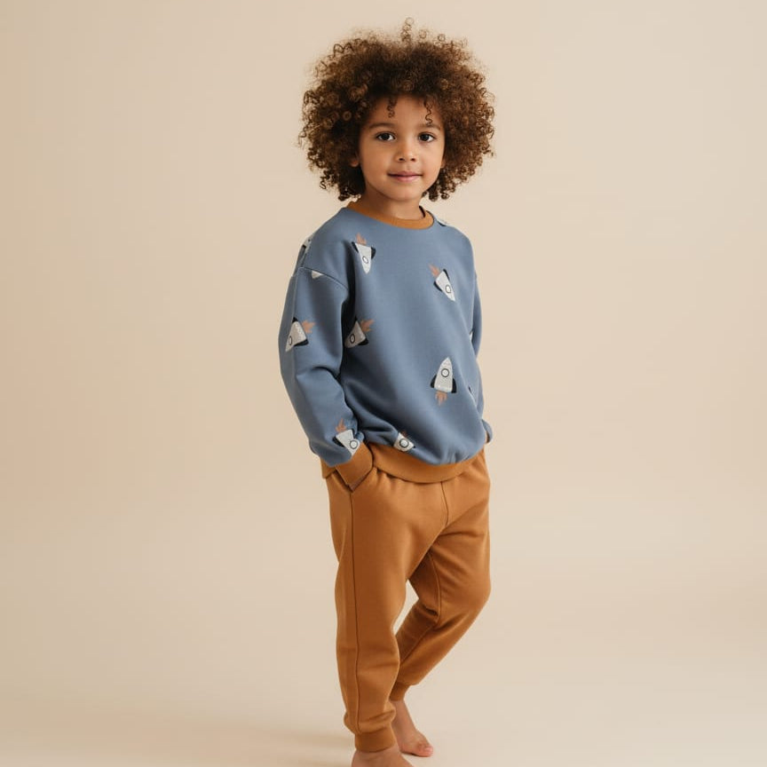Sudadera fina de french terry con estampado de divertidos cohetes. Puño, cuello y bajos en color camel. Composición: 96% algodón y 4% elastano. Sudadera ancha y abrigada para vestir con comodidad y estilo este invierno.